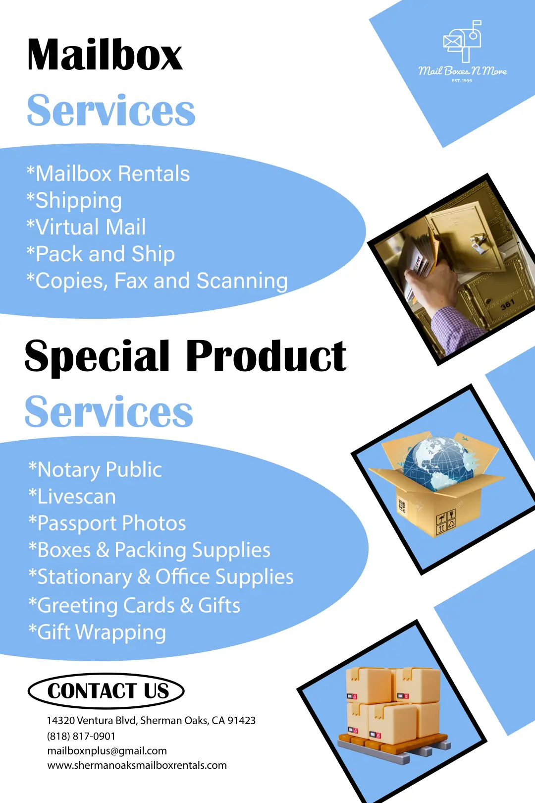 Explore the best postal services with Mail Boxes N More. From letters to packages, we ensure timely and secure deliveries. Our commitment to quality and customer satisfaction sets us apart. We provide top-notch packing materials to guarantee your items arrive safely. Our exceptional shipping service ensures you’ll be more than satisfied with the results. No one matches our expertise and value. We offer outstanding deals in messenger services and go above and beyond to meet your needs. Whether you need greeting cards or secure packaging, Mail Boxes N More in Sherman Oaks, CA, is your go-to destination for postal excellence.
